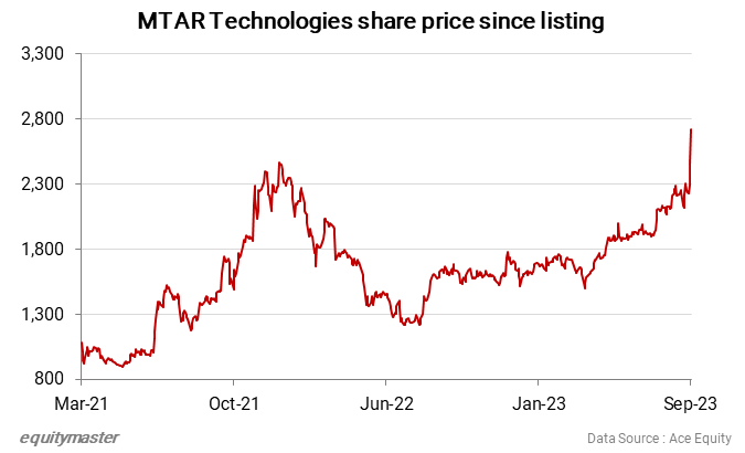 MTAR Technologies’ share price history shows that the company debuted on the stock market in March 2021 through an initial public offering (IPO). The IPO was highly successful, with the company’s shares being oversubscribed more than 200 times. This overwhelming response from investors reflected the market’s confidence in MTAR Technologies and its growth potential.